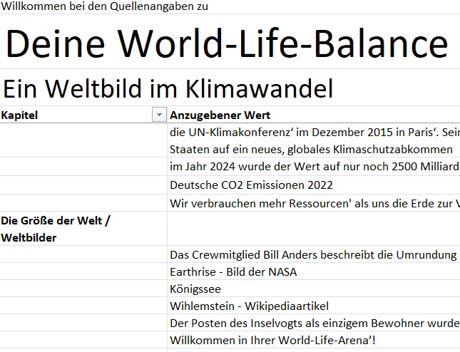 In der Excel-Datei finden Sie alle Berechnungen und Links, die als Datengrundlage für „Deine World-Life-Balance“ verwendet wurden.